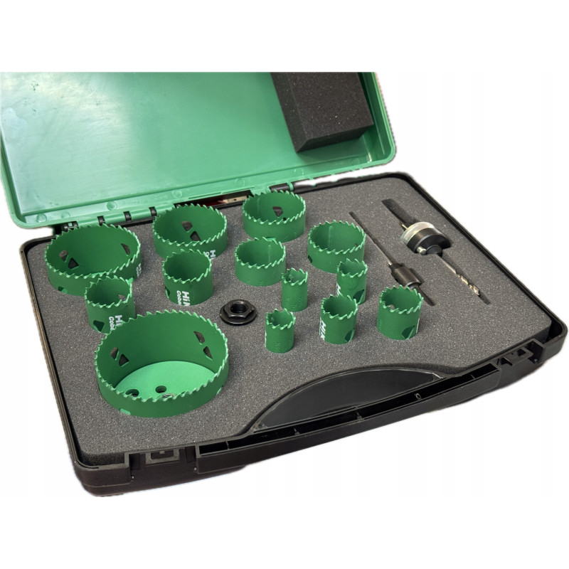 - Zestaw otwornic bimetalowych wykonanych ze stali szybkotnącej HSS z 8% dodatkiem cobaltu poddanych obróbce laserowej.
