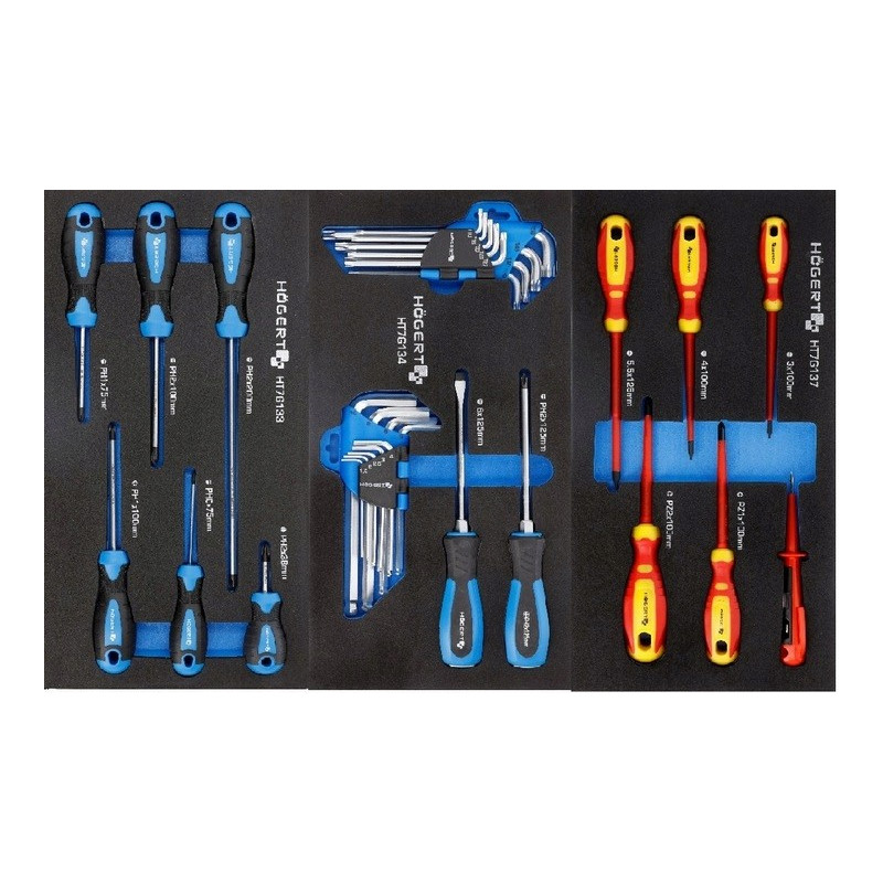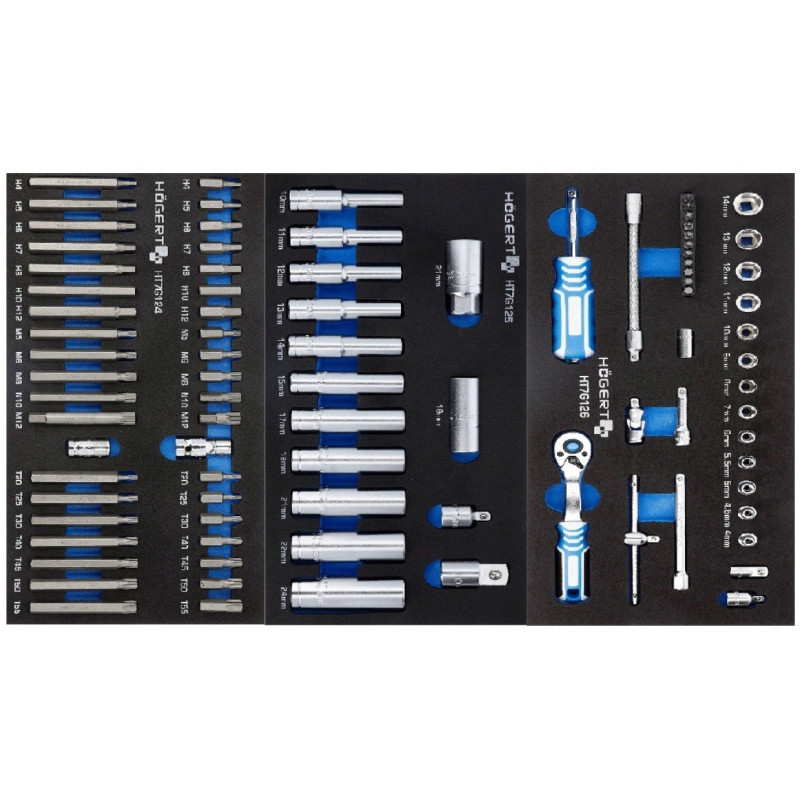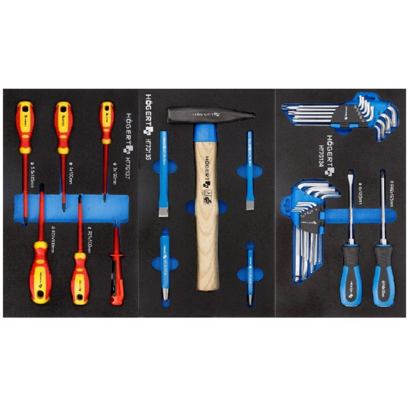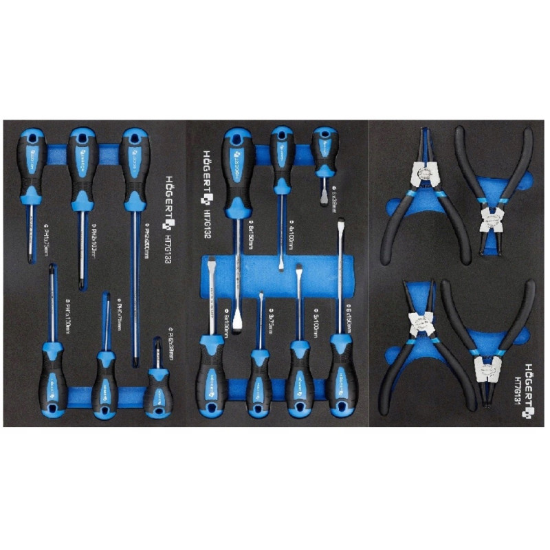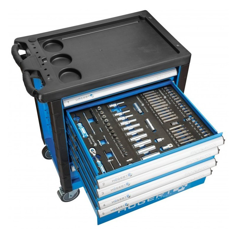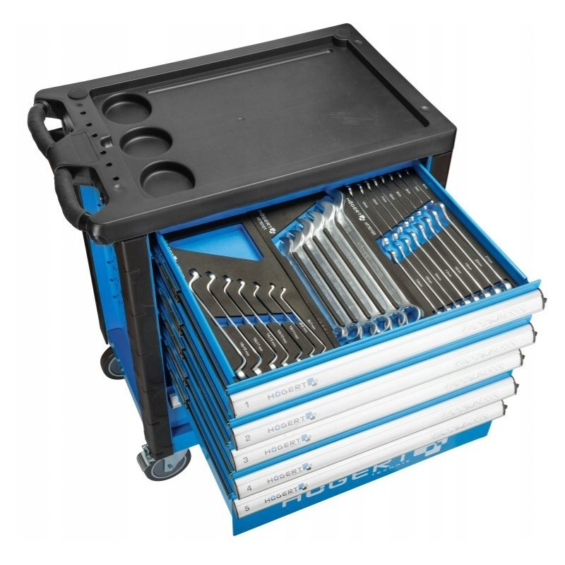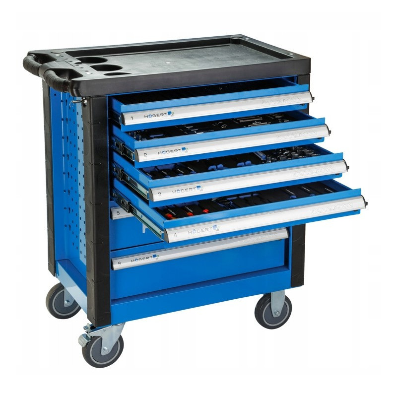 Szafka z narzędziami Hoegert Technik HT7G056Opis produktu Praktyczna szafka narzędziowa 6-szufladowa z wyposażeniem. Znajdzie zastosowanie w warsztacie samochodowym lub w garażu każdego majsterkowicza. Charakterystyka 6 wysuwanych szuflad: 4 szuflady wys. 75 mm i 2 szuflady wys. 154 mm prowadnice szuflad z mechanizmem kulkowym wykonane z wysokogatunkowych materiałów blokada zabezpieczająca przed samoczynnym wysunięciem szuflad koła z PCV w rozmiarze 5 x 1,24” z łożyskami kulkowymi dwa koła skretne, co pozwala na swobodne przemieszczanie wózka możliwość zablokowania szafki przed przesuwaniem zamknięcie szafki na klucz, w zestawie 2 kluczyki wzmocniony blat z tworzywa ABS. Zawartość wkładów: HT7G120, HT7G121, HT7G122, HT7G124, HT7G125, HT7G126, HT7G127, HT7G128, HT7G130, HT7G131, HT7G132, HT7G133, HT7G134, HT7G135, HT7G137. | ![]() |