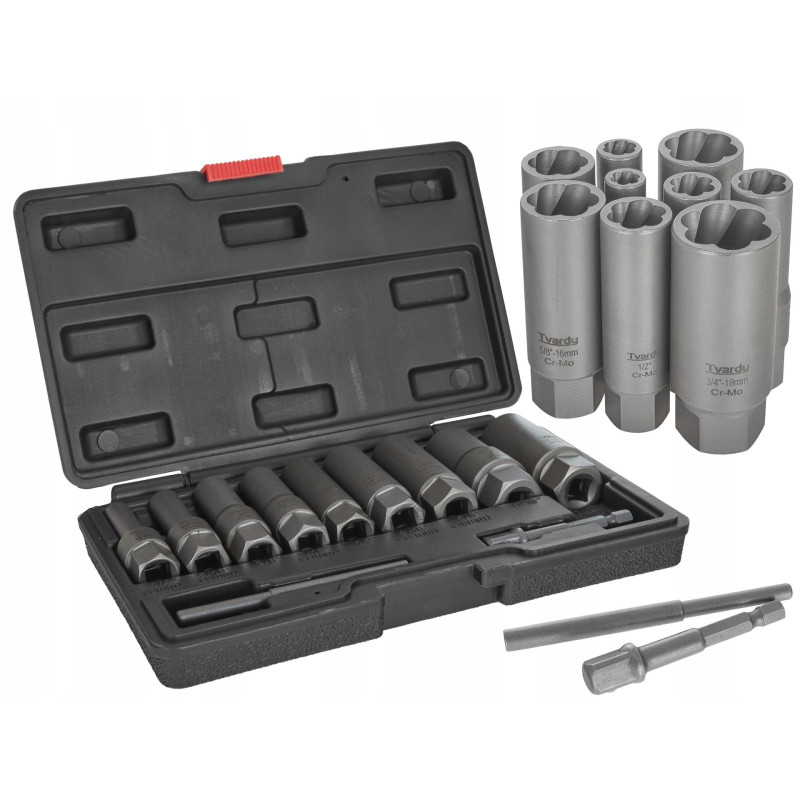 ? Zestaw długich specjalistycznych nasadek do urwanych śrub 6-19 mmSpecjalistyczne nasadki do odkręcania urwanych/uszkodzonych śrub. Specjalny kształt wewnątrz nasadki umożliwia wkręcenie się w uszkodzoną śrubę i odkręcenie jej z łatwością co w przypadku klasycznego odkręcania byłoby bardzo ciężkie lub niemożliwe.