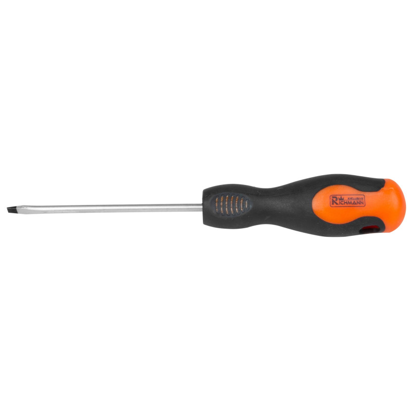 Magnetyczny wkrętak ręczny z grotem płaskim.OPIS PRODUKTU: Część robocza wkrętaka została wykonana ze stali chromowo-molibdenowej (Cr-Mo), dzięki temu są wytrzymalsze przy niższej masie własnej, zaś dodatek molibdenu zapobiega deformacjom oraz podwyższa ogólną odporność stali na korozję w środowisku wilgotnym i kwaśnym. Posiada namagnesowany grot. Rękojeść pokryta gładką antypoślizgową powłoką. W uchwycie wyposażony w oczko pozwalające na zawieszenie na haku. DANE TECHNICZNE: